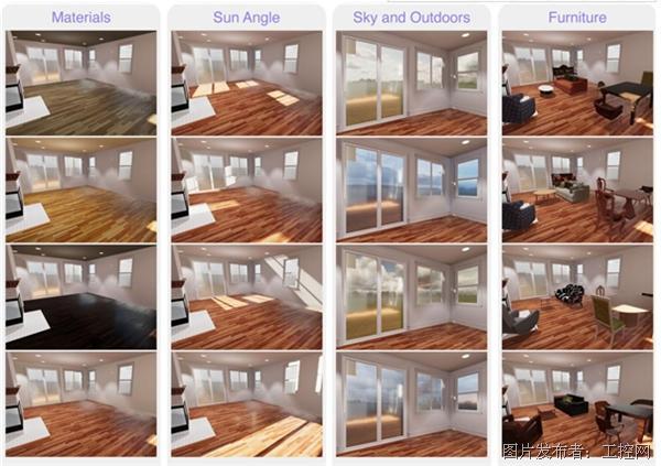 在实际应用中,Unity家居设计借助程序化方法在数据集中摆放家具,在诸如镜头位置、家具材料、光照、一天时间、天空和室外环境等组成上添加随机元素,还添加了自定义对象的支持。