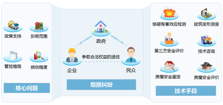 围绕着炮损纠纷的四个核心问题,构建政府、企业、民众相互约束的安全管理制衡机制,并利用爆破安全评价、监测、鉴定、 理赔、管控等技术手段,从爆破前、爆破中、爆破后三个阶段进行预防和处置爆破作业引起的“工扰民、民扰工”问题。