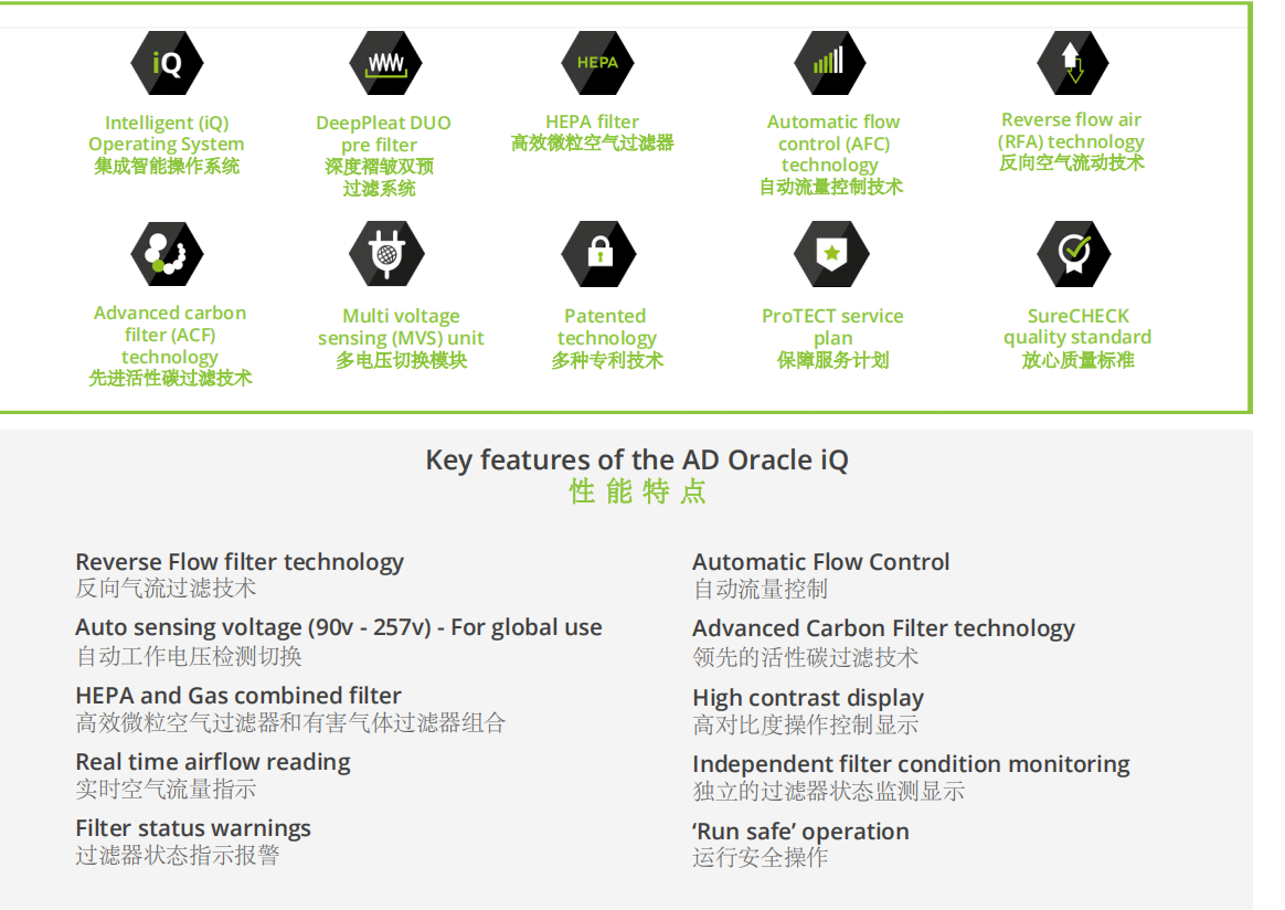 The premier choice and best in class solution with unique features in a compact unit. 集成超强性能的一体化烟雾净化系统,是激光烟雾净化应用的最佳选择。 The ‘Best in Class’ high performance AD Oracle has now been further enhanced with the introduction of BOFA’s new iQ Operating System, combining a range of unique features into one compact unit. AD Oracle系统集成了BOFA最新iQ智能操作系统,组合多种独特功能 于一身,方便操作及运行管理。