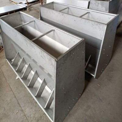育肥双面槽分为育肥大单面箱和大双面箱,小猪双面中箱,仔猪单面小箱,母猪槽。一个双面能喂二十头以上,单面十头以上。一次投料一百斤可喂1--3天,省时省力,增重快。干净卫生,减少肠道疾病。猪始终保持八分饱,处在生长 状态。