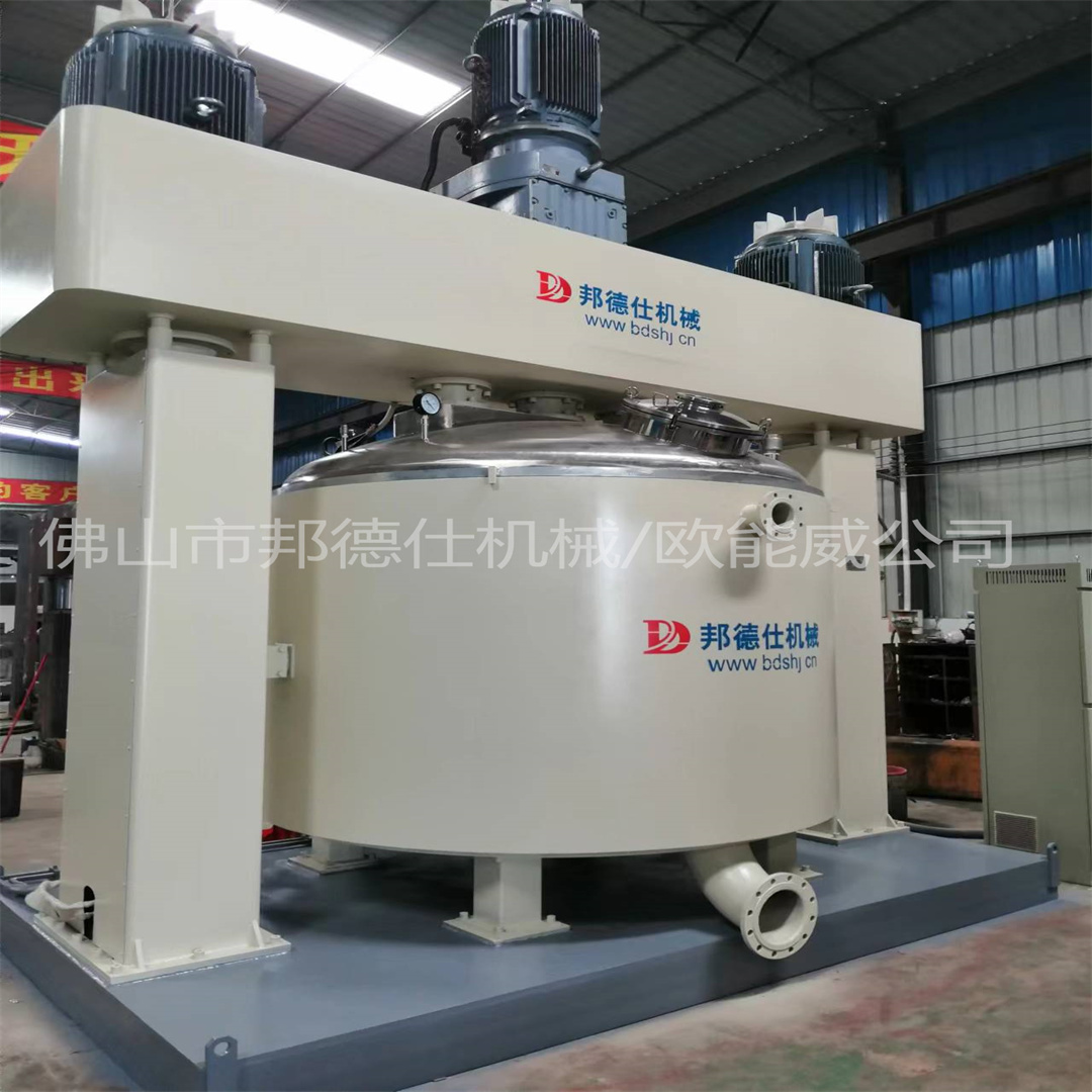 剪切目的。另两支单独动力装置的高速分散齿盘亦随公转一起沿搅拌
