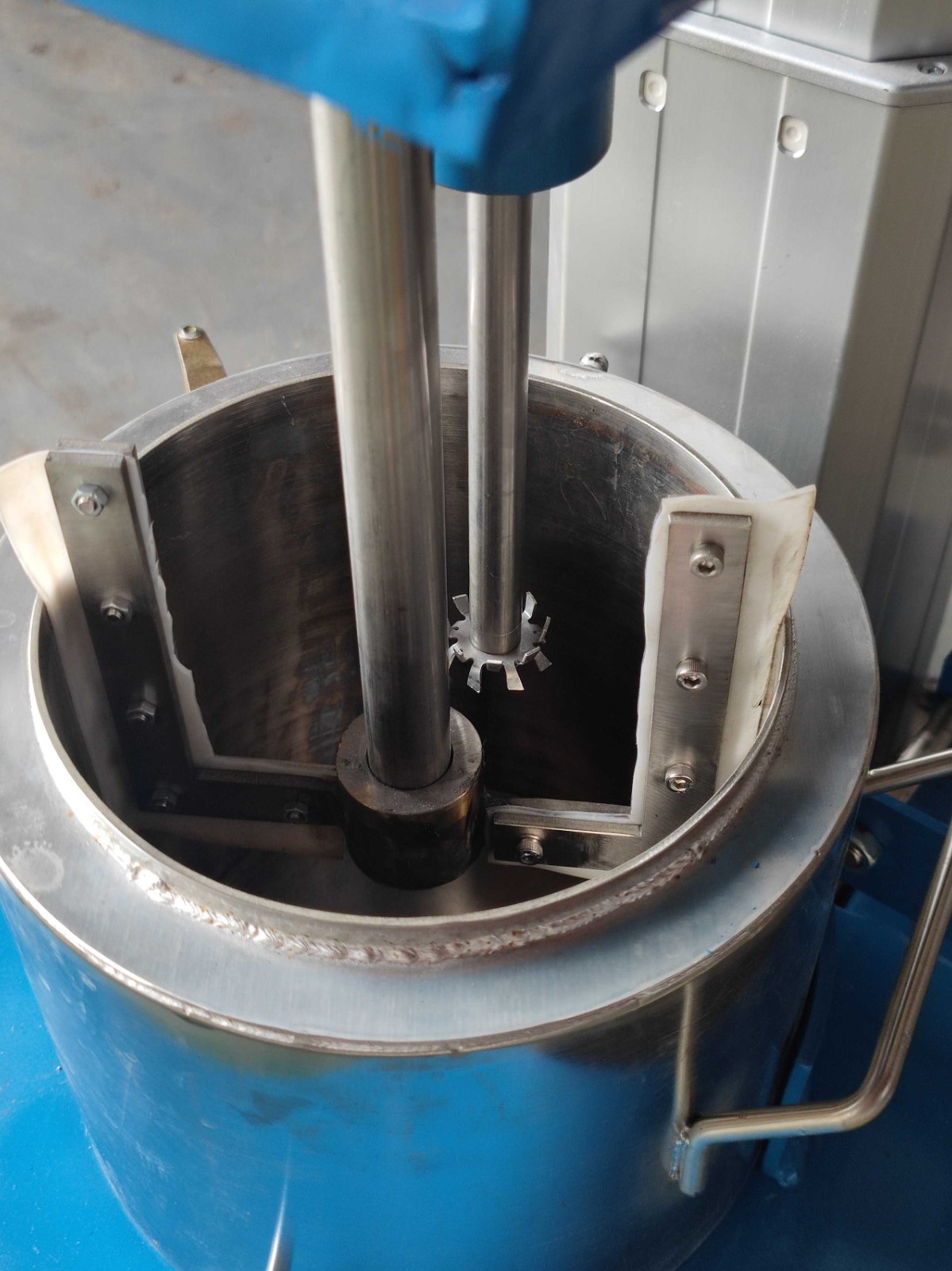 3、低速框式搅拌的外缘与混料罐间隙很小,能起到刮壁的作用。
