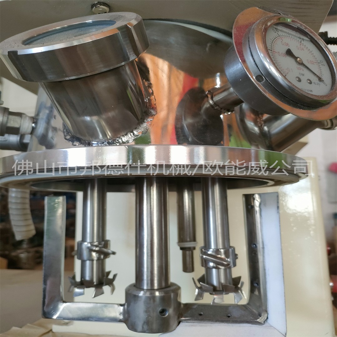 剪切目的。另两支单独动力装置的高速分散齿盘亦随公转一起沿搅拌