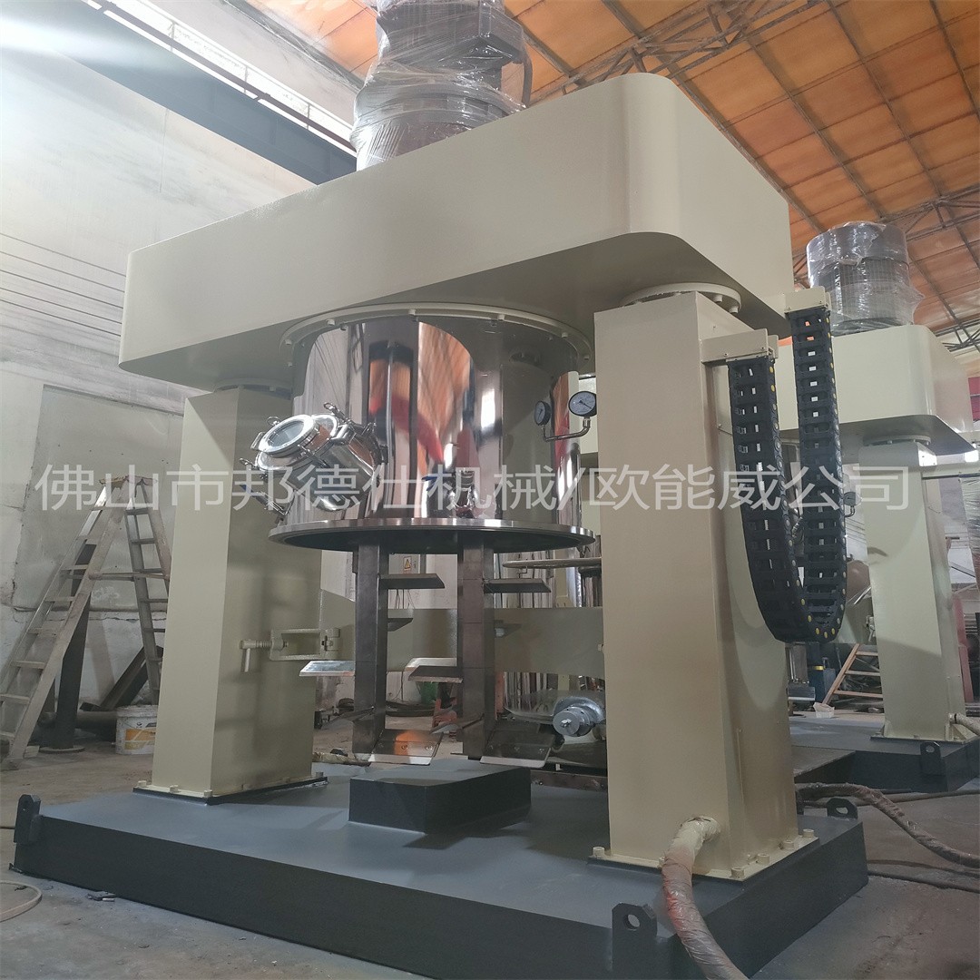 行星搅拌机是一种新型高效无死点混合搅拌设备,它具有独特、新颖的搅拌形式,釜内有两根或三根搅拌器和一至两个自动刮刀,搅拌器在绕釜体轴线公转的同时,又以不同的转速绕自身轴线自转,使物料在釜体内作复杂的运动,受到强烈的剪切和搓合。此外设备内的刮壁刀绕釜体轴线转动,将粘在壁上之物料刮下参于混合,使其效果更为理想。搅拌器的形式,根据物料要求可为多层浆叶式、框式、蝴蝶式、叶轮式等。