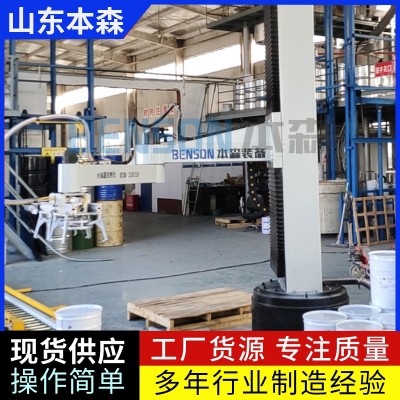 以山东本森智能装备有限公司生产的乳化剂码垛机器人为例,该机器人具有4个自由度(轴),最大负载能力为130kg,重复定位精度为±0.2mm,最大覆盖范围达到3100mm。这种机器人能够广泛应用于化工、建材、食品、饮料等多个行业的桶装物料码垛生产线。