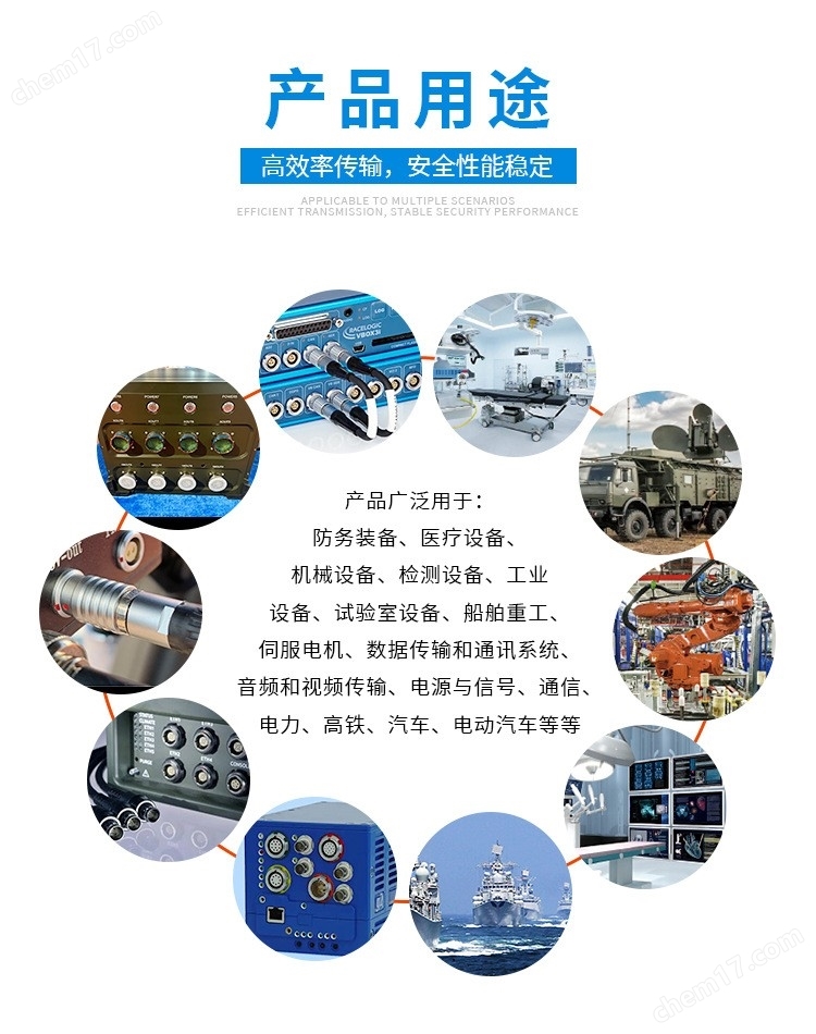 公司产品广泛用于:军事装备、医疗设备、机械设备、检测设备、工业设备、试验室设备、船舶重工、伺服电机、数据传输和通讯系统、音频 和视频传输、电源与信号、通信、电力、高铁、汽车、电动汽车等等