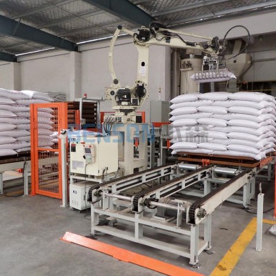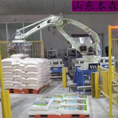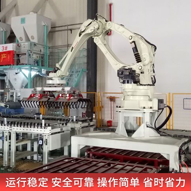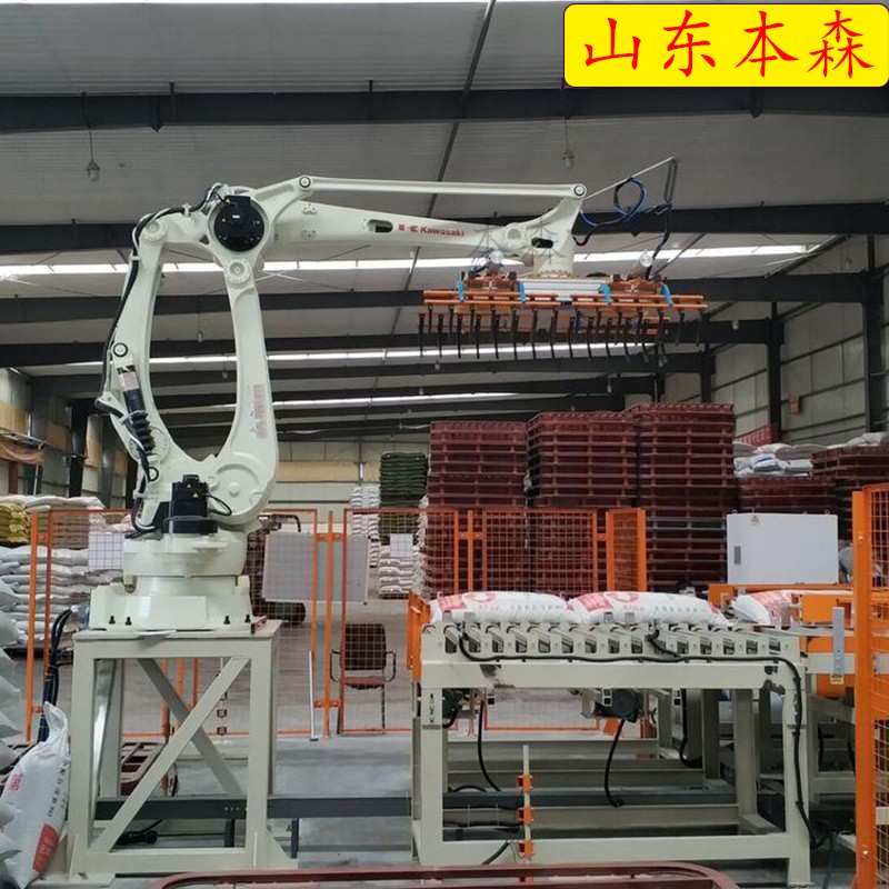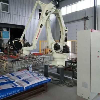 码垛机器人:这是设备的核心部分,它负责将饲料从输送线上抓取起来,并按照预定的规则和顺序码垛到托盘上。码垛机器人通常配备有先进的传感器和控制系统,可以精确识别物料的位置和姿态,确保码垛的准确性和稳定性。