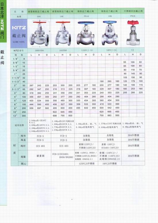 日本北泽KITZ截止阀:截止阀的启闭件是塞形的阀瓣,密封面呈平面或锥面,阀瓣沿流体的中心线作直线运动。阀杆的运动形式,有升降杆式(阀杆升降,手轮不升降),也有升降旋转杆式(手轮与阀杆一起旋转升降,螺母设在阀体上)。截止阀只适用于全开和全关,不允许作调节和节流。