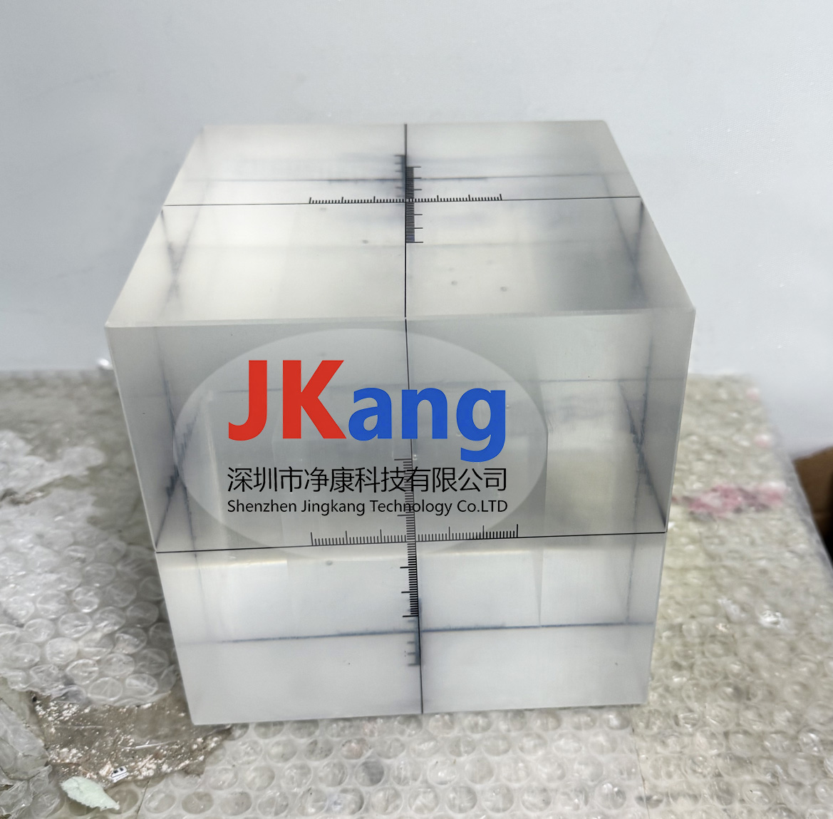 6. 尺寸精确 ,其各面的中心刻有十字标识,立方体内中心点放置一直径为 2.00mm 高密度乌珠球,周边按标图尺寸放置钢球