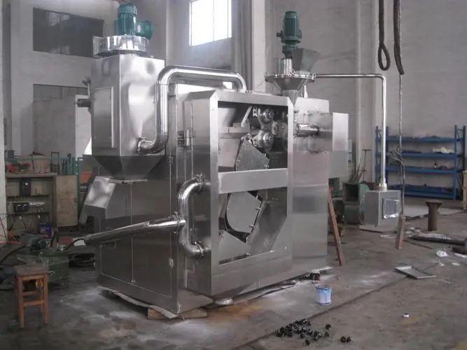 干法制粒机是将混合好的含有一定结晶水,干的粉末物料(西药或中药提取物),倒入锥形料斗,通过异形不等距锥形螺杆的向下旋转送料产生预压力,使物料被压缩、除气,并且均匀地分布在二个压轮的表面上,到咬合区,然后被具有一定挤压推力的二个压轮咬入,先挤压成溥片,再切碎、至制粒系统中造粒的一个过程。