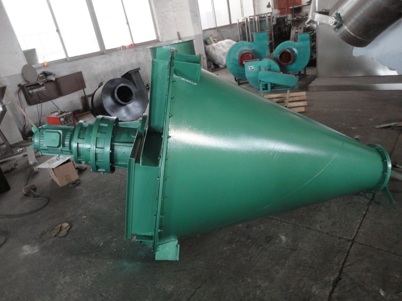 标准型锥形混合机有一长一短两根搅拌螺旋,实际应用中根据设备规格大小还可以采用单(一根长螺旋)、三(两短一长对称布置)螺旋。
