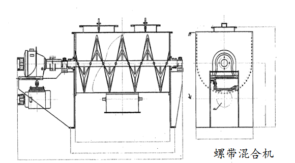 螺带混合机由安装于搅拌轴上的内外径螺旋带动桶体内物料翻动,使搅拌器在桶体内范围翻动物料。搅拌器结构上,螺旋设计成内外、左右互为反螺旋,搅拌器工作时内螺旋带动靠近轴心处物料做轴心旋转,轴向由内至两侧推动,外螺旋带动靠近筒壁物料做轴心旋转,轴向由两侧至内推动,于是造成物料在筒体内对流循环、剪切渗混,完成物料在较短时间内快速均匀混合。