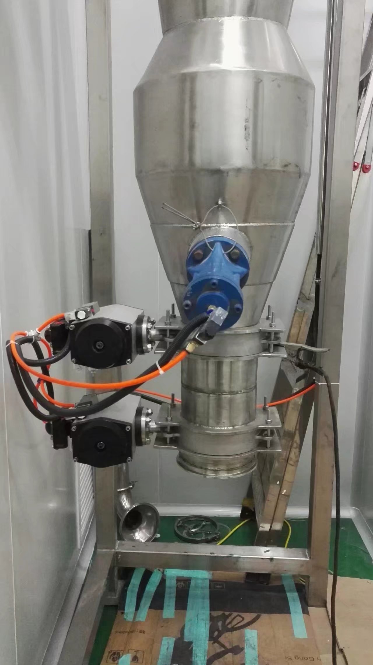 料桶具有内桶体和保温外桶体组成,具有双层保温效果,内桶壁的温度与物料的温度相差无几,这样可不让物料中的水份在料桶壁上凝结成冷凝水,形成物料粘贴在桶体壁上,因保温又能降低了能源消耗;取样器可方便取样,且整体进程呈封闭状况,取样便利、方便、密封;敲击块是在干燥制粒进程中,会有些物料粘贴在料桶壁上,形成干燥不均匀,用手锤敲击后可使物料进入沸腾状况,得到热量,持续干燥;视镜用于观察在干燥进程中的工艺状况;真空出料口用于在干燥完结,将桶内成品颗粒用真空源抽出,进入下一道工序,密闭转移,不让形成二次污染;料桶体的底部安装了不锈钢烧结网转盘及转动机构,物料附着在不锈钢烧结网转盘上,跟着不锈钢结网转盘一同转动,能使因气流不均匀形成物料干燥的不均一性。