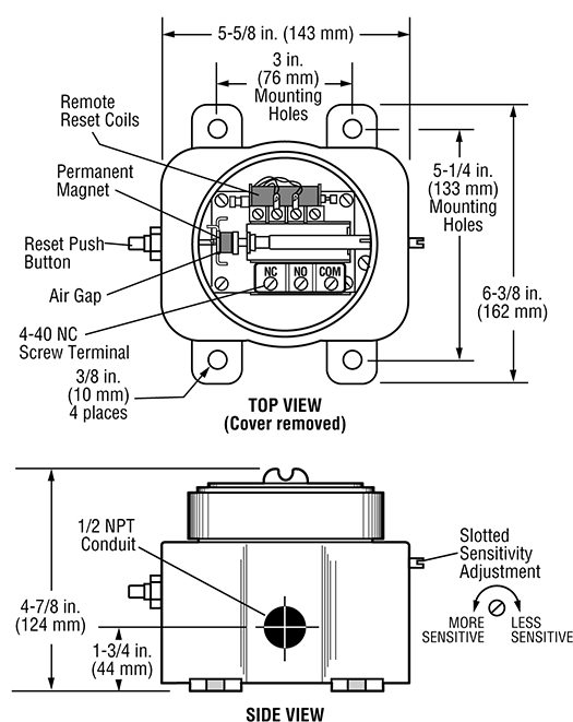 按下复位按钮将脱扣闩锁移动到磁性保持位置。冲击/振动会将磁铁移出此保持位置,从而释放弹簧加载的跳闸闩锁以转移触点并关闭机器(参见零件的尺寸图或视觉表示)。
