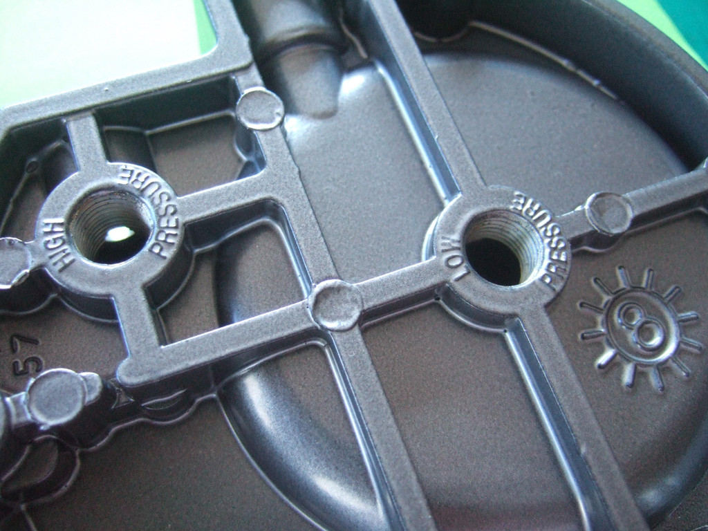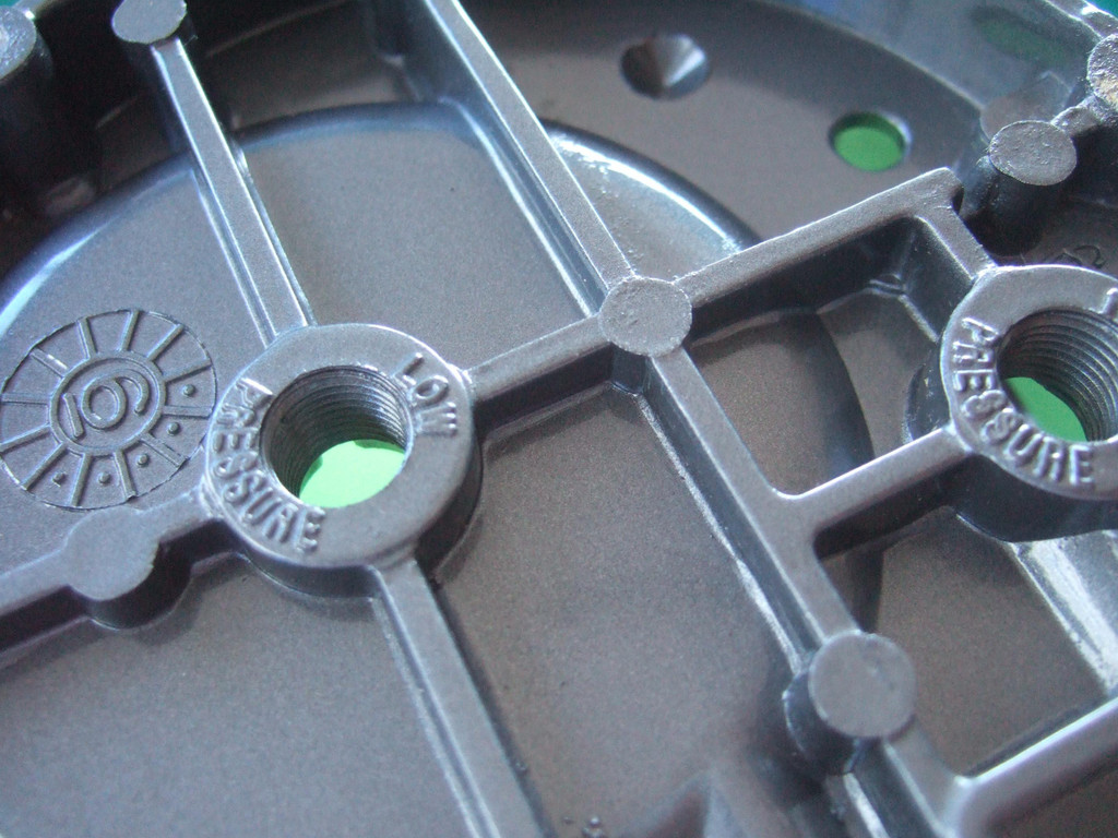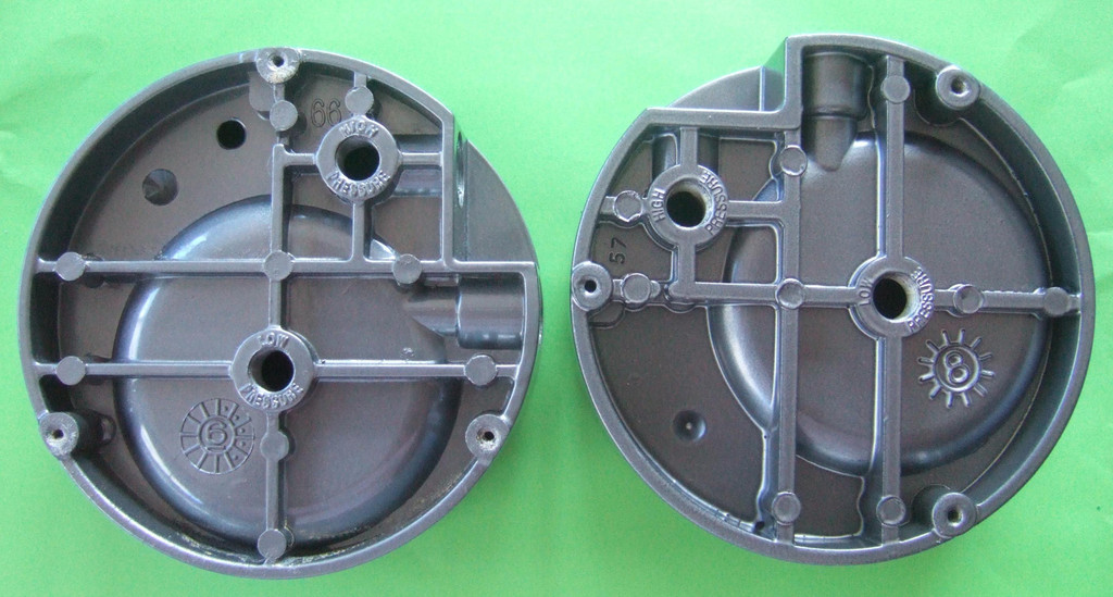 四,以下图上是兄弟厂家内部喷白漆处理,绝无贬低兄弟厂家的意思,只是对比不同的工艺,或与外协厂家的工艺有关,下图左为美国威德尔(杜威)公司的经典处理,下图右为本公司生产的压差表铝壳,抗氧化的成本与工艺相对复杂,成本也高,