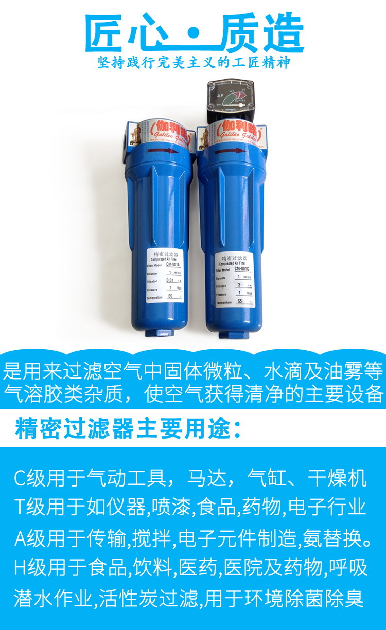 功能:将压缩空气中微量油气精密滤除至0.01PPM同时滤除空气中杂质颗粒至0.01MICRON达到无油标准的高品质压缩空气.能滤除小至0.01μm的液体及固体微粒,达到最低残油含量仅0.001ppm,几乎所有的水分、灰尘和油都被去除。