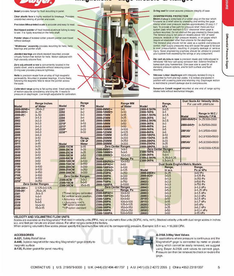 美国DWYER公司有多种系列的差压表、差压计如:Dwyer 2000系列 膜片式压差表、Dwyer4000系列Capsuhelic®差压表、Dwyer2-5000系列膜片式差压表;Dwyer 477 系列 手持式数字差压计、Dwyer 477 A 系列手持式数字差压计等。