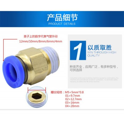 插式气动管接头 | | 公制 | 英制 | | Code | 4 | 6 | 8 | 10 | 12 | 16 | 5/32 | 3/16 | 1/4 | 5/16 | 3/8 | 1/2 | | Dia | 4 | 6 | 8 | 10 | 12 | 16 | 5/32 | 3/16 | 1/4 | 5/16 | 3/8 | 1/2 | 螺纹型式及尺寸 | | 公制 | | Code | M5 | M6 | M8 | M10 | M12 | M12A | M14A | M16 | M20 | | Dia | M5 x 0.8 | M6 x 1 | M8 x 1 | M10 x 1 | M12 x 12.5 | M12 x 1.5 | M12 x 1.5 | M16 x 1.5 | M20 x 1.5 | | | 55o锥管螺纹 | | Code | 01 | 02 | 03 | 04 | 06 | | Dia | R1/8 | R1/ | R3/8 | R1/2 | R3/4 | | | 直管螺纹 | | Code | G01 | G02 | G03 | G04 | G06 | | Dia | G1/8 | G1/4 | G3/8 | G1/2 | G3/4 | | | 美制60o锥管螺纹 | | Code | N01 | N02 | N03 | N04 | N06 | | Dia | NPT1/8 | NPT1/4 | NPT3/8 | NPT1/2 | NPT3/4 | 产品使用说明