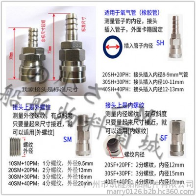 SH20+PH20接8MM内径气管、SH30+PH30接10MM内径气管、SH40+PH40接12MM内径气管、带螺纹的10代表1分G1/8、20代表2分G1/4、30代表3分G3/8、40代表4分G1/2