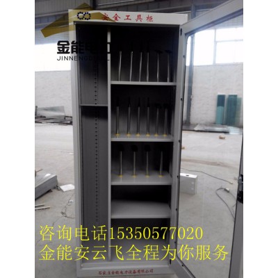 | 电力工具柜 (功能) | 电力工具柜可同时存放绝缘杆、验电器、接地线、绝缘手套、绝缘靴、安全帽、防毒面具、绝缘绳、绝缘挡板、屏蔽服等电力安全工器具,分类有序,分组整齐存放,实现了安全工器具防潮、防尘、防损、整齐美观于一体的标准化管理。 |