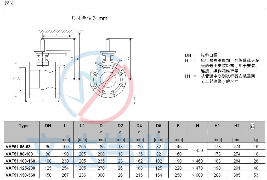 西门子VAF51.125-200电动法兰球阀尺寸图: