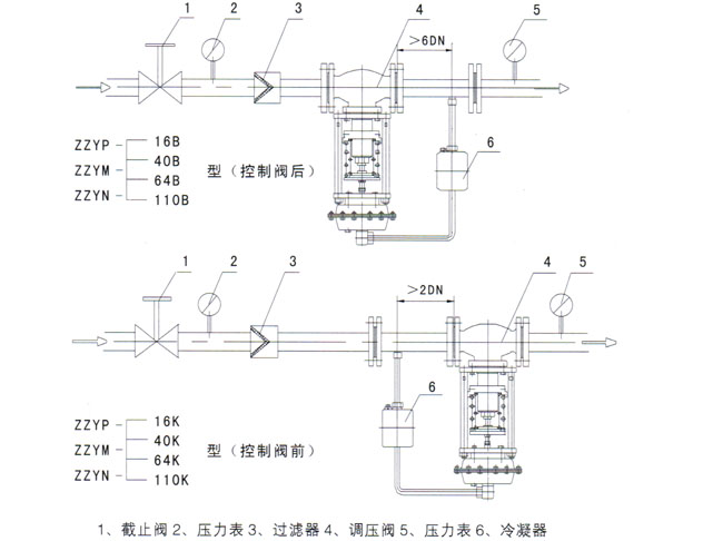 1、阀在气体或低粘度液体介质中使用时,通常ZZY型自力式压力调节阀为直立安装在水平管上,当位置空间不允许时才倒装或斜装。(当确认介质很洁净时,件3可不安装)