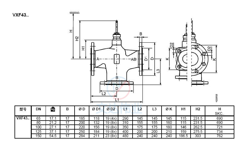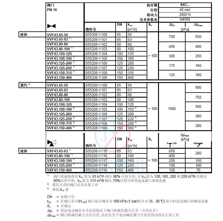 VXF43.65三通座阀用于锅炉、区域供热和制冷设备,冷却塔、加热机组和空调机组中作为控制或截止阀们,适用于闭式或开式管路系统。阀体耐温-20-+220度,口径范围DN65-150,阀体材质为球墨铸铁,阀体可与SKC系列的执行器匹配组合使用。