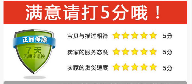 4.自购买商品到货后2天内不满意的,在不影响二次销售的情况下,均允许退货(来回运费均由买家承担,请在退货前确认商品包装完好,配件齐全,表面无磨损,不符合的请勿发回,以免浪费买家时间和金钱),订做产品不能退货(有质量问题除外)。