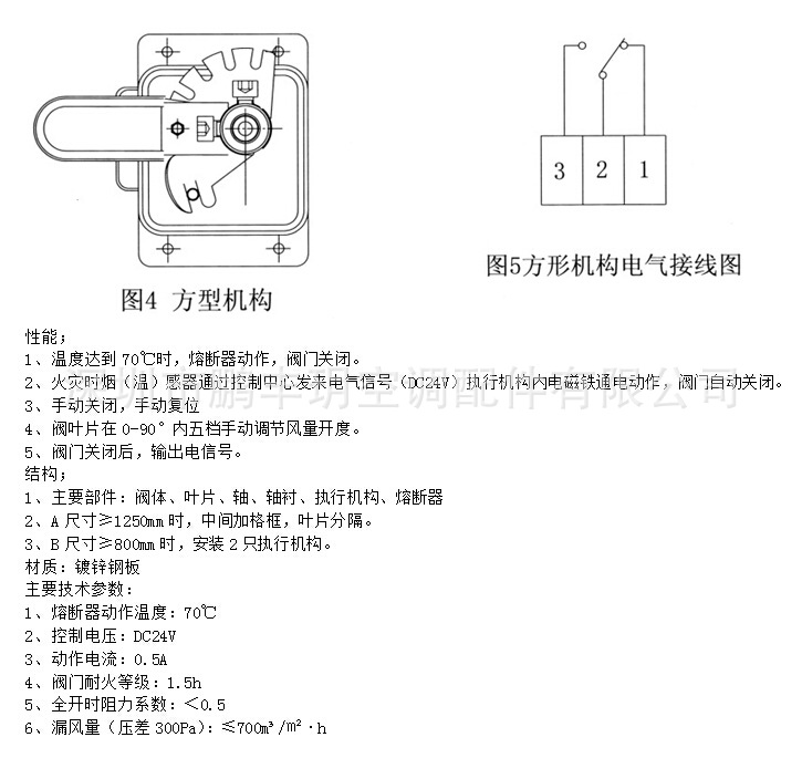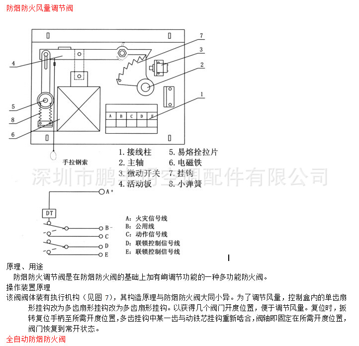 该阀体装有执行机构,平时处于全开状态。当火警发生时可手拉钢索使挂钩(4.7)脱开关闭阀门,可由消防控制中心接通DC24V电源,电磁铁(6)动作,使动铁芯挂钩(4)与阀轴(叶片轴)挂钩(7)脱开,阀门受关闭弹簧力作用而迅速关闭,认隔断烟雾和火焰通过管道中蔓延,达到防烟防火目的。当管道气流温度达到70℃时,易熔片熔断,熔断器芯杆顶端脱开控制盒内的小弹簧(8),动铁芯挂钩(4)失去弹簧力平衡而脱开阀轴挂钩(7),阀门在关闭弹簧力作用F迅速关闭,防止火灾蔓延。