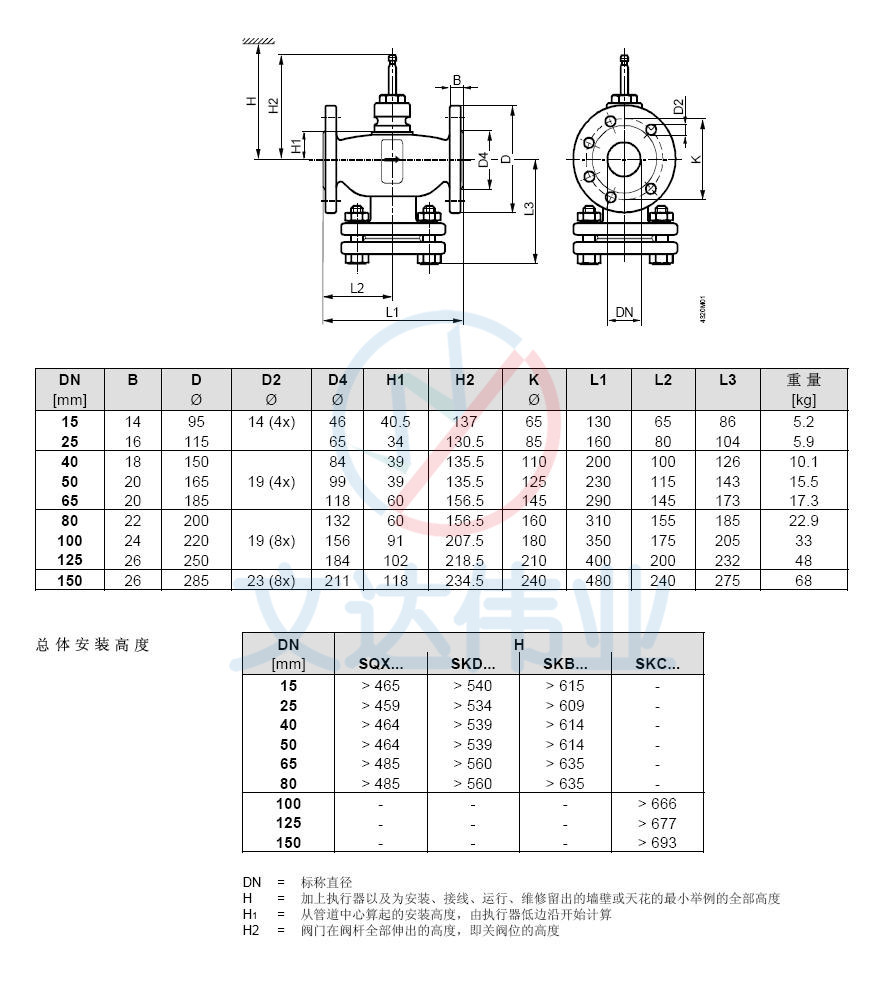 阀体材质为球墨铸铁,通径范围DN15-150,行程为