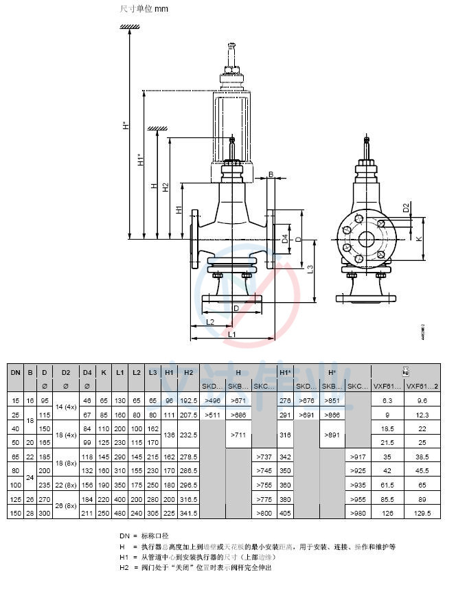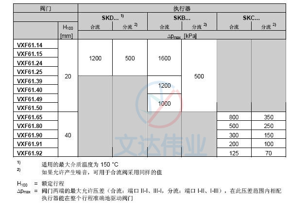 VXF61.25三通座阀与执行器匹配表
