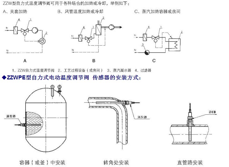 ◆ZZWPE型自力式电动温度调节阀 安装使用及维护: 1、安装 (1)安装前应对管道进行严格除污,吹净焊渣等杂物,否则将严重损坏阀门。
