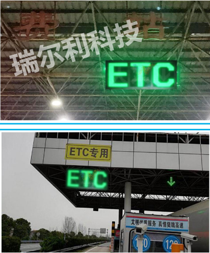 设置于ETC车道迎车方向收费雨棚上,可显示字母"ETC"、叉号(用X表示)和两种图形。字母:“ETC”亮时为绿色或黄色,表示此车道为不不停车收费车道,状态正常;叉号(用X表示)亮时为红色,表示此车道禁止通行;