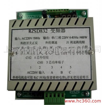 上海任重仪表电器有限公司*上海百乐神自动化科技有限公司 **产品,严禁仿制 索引:单相变频器,单相调速器,单相电机控制器交流调速器,单相电机调速器,单相电机变频器,风机调速器,单相输出变频器,单相交流电机调速器高性能单相变频器,简易单相变频器,交流无极变频装置RZSD8 3 2(RZSD04)变频器使用说明 本变频器一般适用于单相220V电容启动,电容运转,同步减速等单相电机,也使适用于三相220V电机,三相380V电机(功率大约下降至原来的4 0%)。但本变频器出厂时只提供单相输出或三相输出两者情况中的一种,不能通用。1.输入: AC220V,50Hz。 .2.输出:单相220V,9 O度移相,三线制;三相220V,1 2 O度移相; 0-85Hz,分辩率0.5Hz**大功率400W。 ,3.控制方案: a.内/外电位器,外控0-5V,电压调节控制变频器速度。 b.可端子控制开机,关机,正转,反转,具有+12V,0V输出。 (开关等对OV有效,+12V为20mA仅供传感器用) 此外,可根据用户要求程序作适当调整完成特定的控制功能。4.联线: 外控端子CH2: 1 2 3 4 5 6 7 8+5V W 0V 正转 反转 开机 关机 +12V强电端子CHl: l 2 3 4 5 AC220V输入 三相 A B C 输出 单相 公共端 主组 副组 三线输出(去掉移相电容) 单相 B C 二线输出(保留移相电容)5.控制面板: J1为跳线选择控制方式,IN为内部电位器调节,OUT为外部50K电位器调节或 外部电压控制,电位器接+5V,w,0V;外部电压接W,0V。 ‘6.电机应用实例: a.对于单相220V异步电机,可不改变原来的接线(保留移相电容,直接接入 B,C(4,5)端,当方向不对时,可在电容端调线为好。 b.对TDY单相同步电机,只能用三线双绕组方式,A(4脚)为公共端,移相电容一定要去掉,这种方式也适用于双绕组普通异步电机(必须去掉移相电容)。 7.应用MCU具有强大的功能,可根据用户的需要,将特定功能设计在变频器内,以满足用户特定的工艺要术。=====================================================================上海任重仪表电器有限公司 电话:021-63511268 63618815 传真:021-63511803地址:上海广西北路528号1103-1104# 网址: //www.renzhong.com