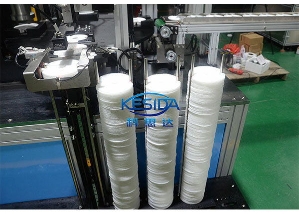 本机用于宠物饮水机过滤器滤棉的全自动化生产. 过滤棉采用双层卷材式来料.主线体采用直线式一出二设计. 碳包棉采用双层卷材式来料.碳包及干燥济采用定量杯式自动装碳.直线式两通道一出四设计. 碳包根据主体结构形状. 采用异型碳包结构形式.填碳面积大.装碳均匀一致. 人工将过滤棉料卷放入料架轴上;料卷采用双面夹子机械手步进送料.