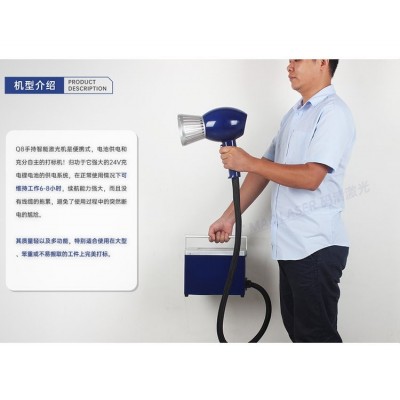 Q8手持真激光打标机是便携式,电池供电和充分自主的打标机!归功于它强大的24V充电锂电池的供电系统,在正常使用情况下可以维持工作6-8小时,续航能力强大,而且没有线缆的拖累,避免了使用过程中的突然断电的尴尬。其质量轻以及多功能,特别适合使用在大型、笨重或者不易搬取的工件上打标。