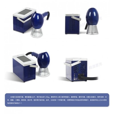 Q8强大且坚固可靠,整机重量6公斤,其打标头仅1.25kg,拥有符合人体工程学的握力,握持舒适,操作方便。后置USB接口,软件支持:文本、图案、二维码、条形码、流水号、图形等打标内容,此外,Q8还有一个储存方便,可携带前往不同地点的专用箱子。是目前市场上较小的充电式激光打标机之一。