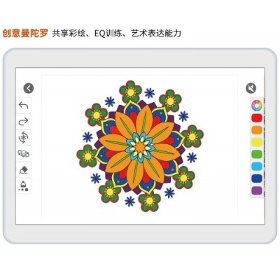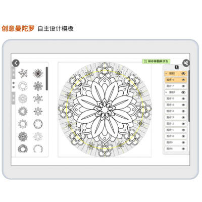在本台设备上可以自由作画保存创意模板也可以利用设备现有的素材进行叠加搭配成自己的作品,然后进行涂色,从而在整个创作的过程中不断地调节自己的情绪和压力,以达到缓解并逐渐自愈的效果。适用于未成年、成年人所有群体,上手简单易操作,广受使用者的一致好评。
