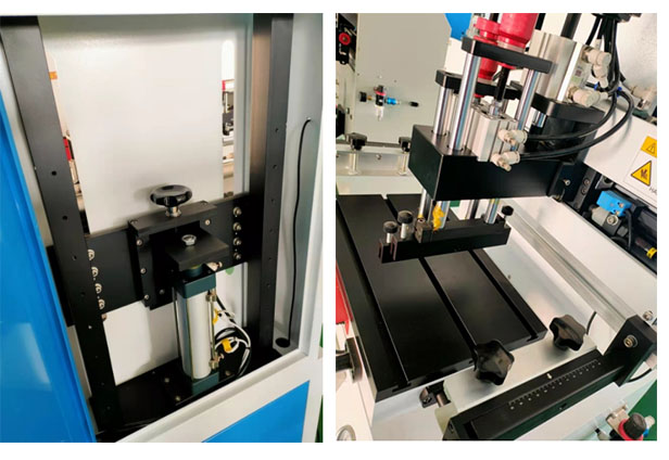 网版上下采用可调缓冲功能气缸驱动,印刷行程采用长行程气缸驱动.稳定精准快速,符合多样化生产效能,工作台面采用独特灵活的三点微调结构装置. 对位方便快捷及工作台吸气真空功能,可通用安装“T"槽型工作台,人机界面触控面板,CPU微电脑控制。