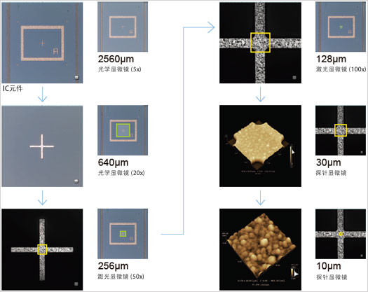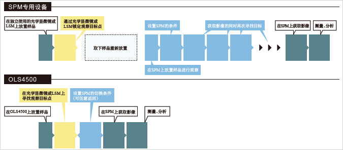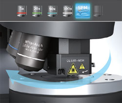 OLS4500在电动物镜转换器上装配了涵盖低倍到高倍观察的4种物镜, 以及小型SPM单元。在光学显微镜或激光显微镜的50倍、100倍的实时观察中, 由于SPM扫描范围一直显示于视场中心, 所以把观察目标点对准该位置后, 只要切换到探针显微镜, 就能够正确接近观察对象。因此, 只需1次SPM扫描就能获取目标影像, 从而能够提高工作效率并降低微悬臂的损耗。