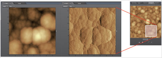 使用向导功能, 可以观察时进一步放大探针显微镜拍到的影像的所需部分倍率。只要在影像上用鼠标指针设置放大范围并扫描, 就可以获取所需的SPM影像。可以自由设置扫描范围, 所以大幅度提高了观察和测量的效率。