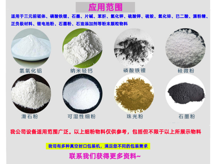 同样适用于三元前驱体、磷酸铁锂、石墨、片碱、苯酐、氯化钾、硫酸钾、硫铵、氧化锌、已二酸、漂粉精等石化、化工、冶金、医药、农药、食品、新能源等行业中各种粉状、颗粒物料封口以及真空包装。