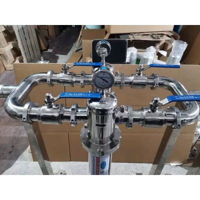 除菌过滤器一般采用十字悬挂式,水平进出。多芯过滤器可设计成落地式。有些使用场合根据实际需要分成预过滤器、精过滤器两种。进入过滤器的压缩空气必须先经过至少三级的精密过滤器及干燥机。除油、除水、除尘,油雾浓度应≤0.01PPM,否则将影响除菌滤芯的寿命,达不到预期的除菌效果。作为罐体、设备的呼吸器使用时,其作用主要在于连通大气防止设备内部负压和隔离开空气中的污染源,过滤方面的功能不大,因此在过滤上基本无要求。根据实际使用情况每周或每月1~2次,每次30分钟,采用经过1μ过滤精度的洁净饱和蒸汽杀菌。蒸汽温度<140℃,蒸汽压力<0.3MPa。阀门缓慢开关。