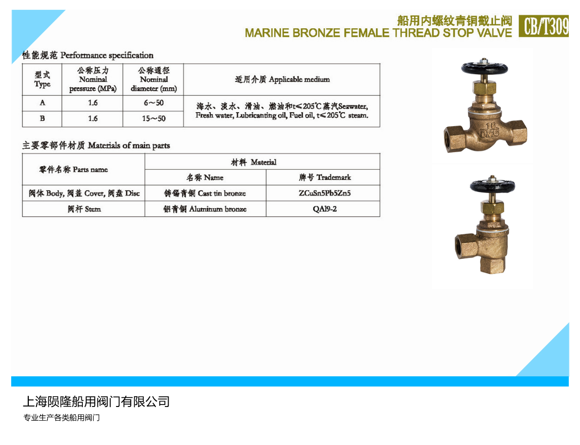 船用法兰铸钢截止阀GB/T584-99船用法兰铸钢截止止回阀GB/T585-99 ,船用法兰铸铁截止阀GB/T590-93船用法兰铸铁截止止回阀GB/T591-93,船用法兰青铜截止阀GB/T597-93船用法兰青铜截止止回阀GB/T588-93型式;A型AS型B型BS型,公称压力;PN0.6 1.0 1.6 2.5 4.0 6.4.适用介质;海水,淡水,滑油,温度不高于300℃的水蒸汽,阀体;铸钢/球墨铸铁/青铜,阀杆;不锈钢/铝青铜,阀盘;不锈钢/锡青铜,公称通径;DN15-DN500.