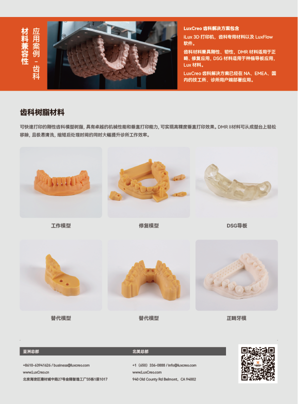 | 材料适用范围 | LuxCreo制造的坚韧、耐温、牙模等材料 |