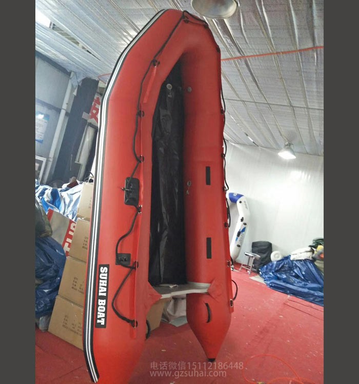 (4)配可拆式木板与铝合金底板,挂机艇艇壳气囊采用胶粘与高周波热合工艺加工制作,气密好、强度高、经久耐用、质量一流,航速40-60公里/小时。充气后可保持至少一周。