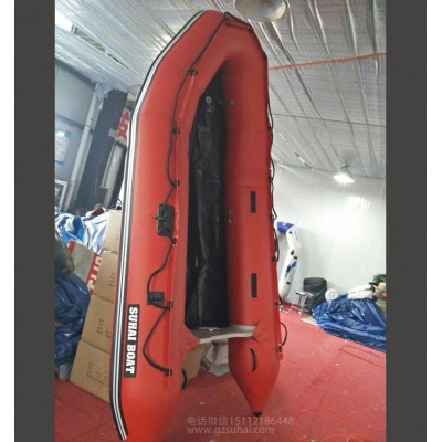 速海专业级橡皮艇【超级黑金刚系列冲锋舟】,船体采用进口加厚1.2MM三层夹网布PVC特别材料涂附,加上640度高温粘合技术使游艇气密性更好,抗磨损耐用、耐盐碱和日光照射、具有高强度抗老化,我们承诺五年质量保证!