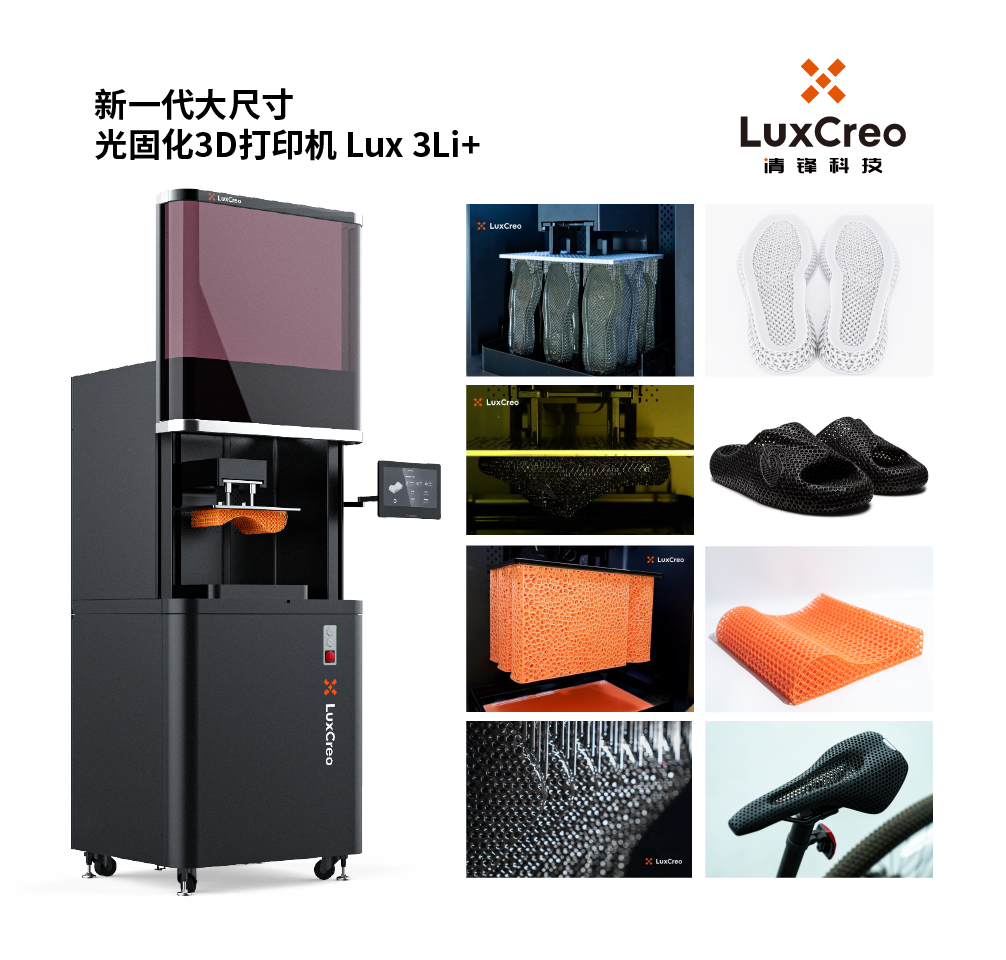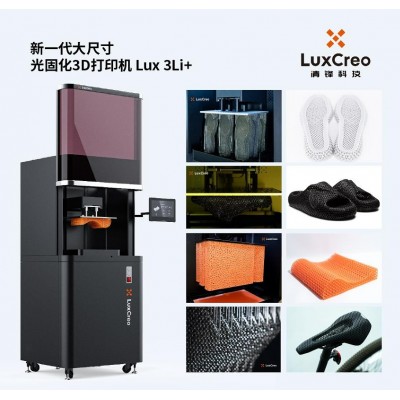 Lux 3Li+是LuxCreo智能工厂的3D打印机的最新迭代版本,其开发平台得到了数万个零件打印的检验,适用于鞋材、运动装备、汽车内饰件、机电产品外壳、工装夹具等产品的快速制造、小批量生产。