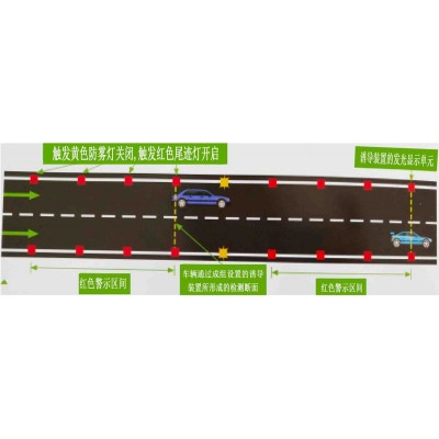 安装区域能见度在50m-200m时,车辆经过尾迹灯时,在车后一段距离黄灯闪烁转换成红色常亮,形成一段红色尾迹,警示后方车辆;车辆驶过一段距离后,红灯切换为黄灯闪烁,红色尾迹灯与车辆动态前移。