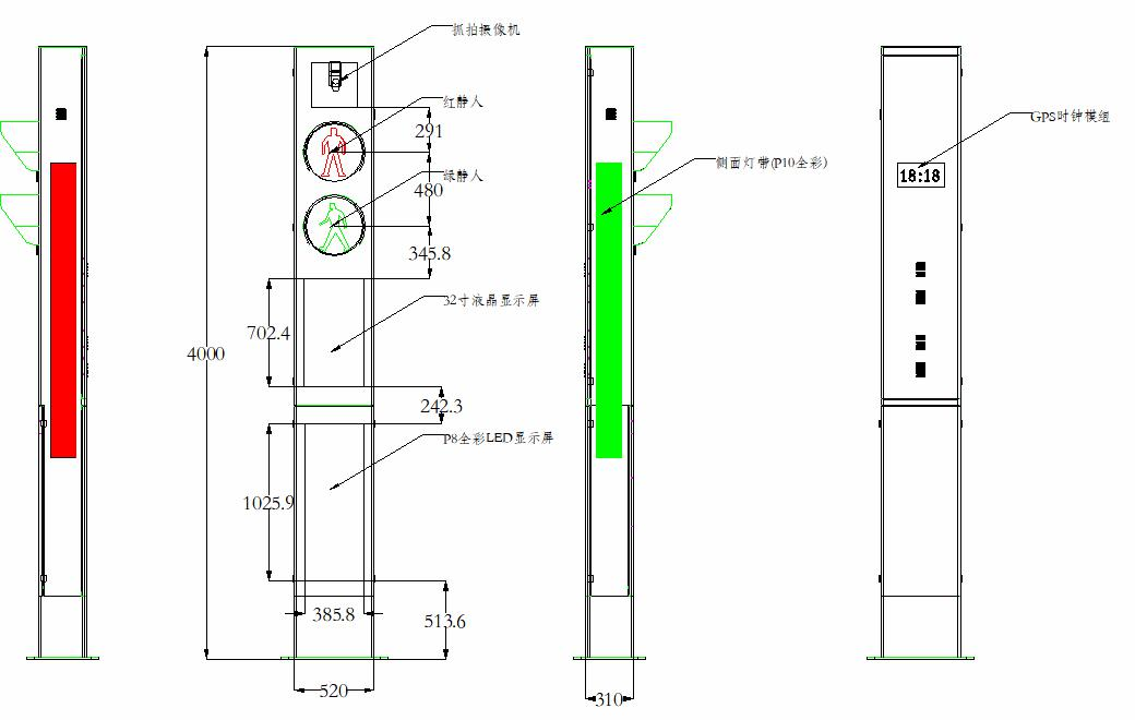 集成全彩 LED 显示屏(P8,384*1024mm),节目根据红绿灯切换,可显示用户定制信息